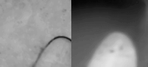 С другой стороны, тепловизоры обладают высокой эффективностью в обнаружении живых объектов - они хорошо показывают людей и животных на фоне окружающей среды, но при этом могут «скрывать» важные элементы рельефа или искажать восприятие дистанции. Нагретые предметы, влажные поверхности или камни могут выглядеть ярче или темнее, чем реальные препятствия, что делает перемещение затруднительным. Кроме того, использование тепловизора в транспорте также ограничено - он не позволяет видеть через лобовое стекло, что делает невозможным его применение при вождении. Именно поэтому в качестве очков они практически не используются.На изображении ниже с цифрового канала (слева) заметна тропа, которая не видна на тепловом изображении (справа):