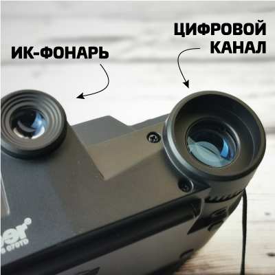 На передней части бинокля можно видеть два объектива - один с прозрачной линзой (цифровой канал) и один с чёрной германиевой линзой (тепловизионный канал). В верхней части расположен инфракрасный фонарь.