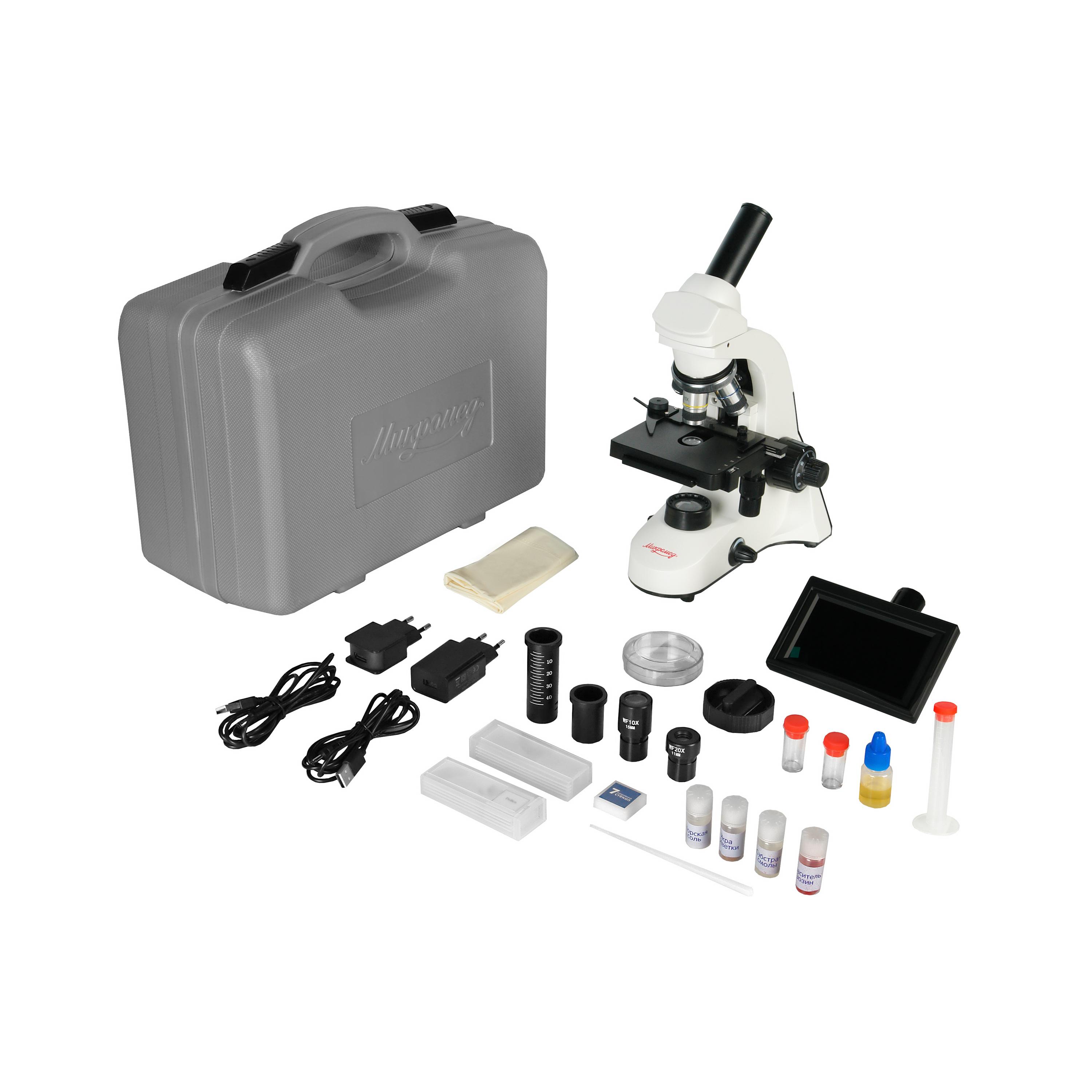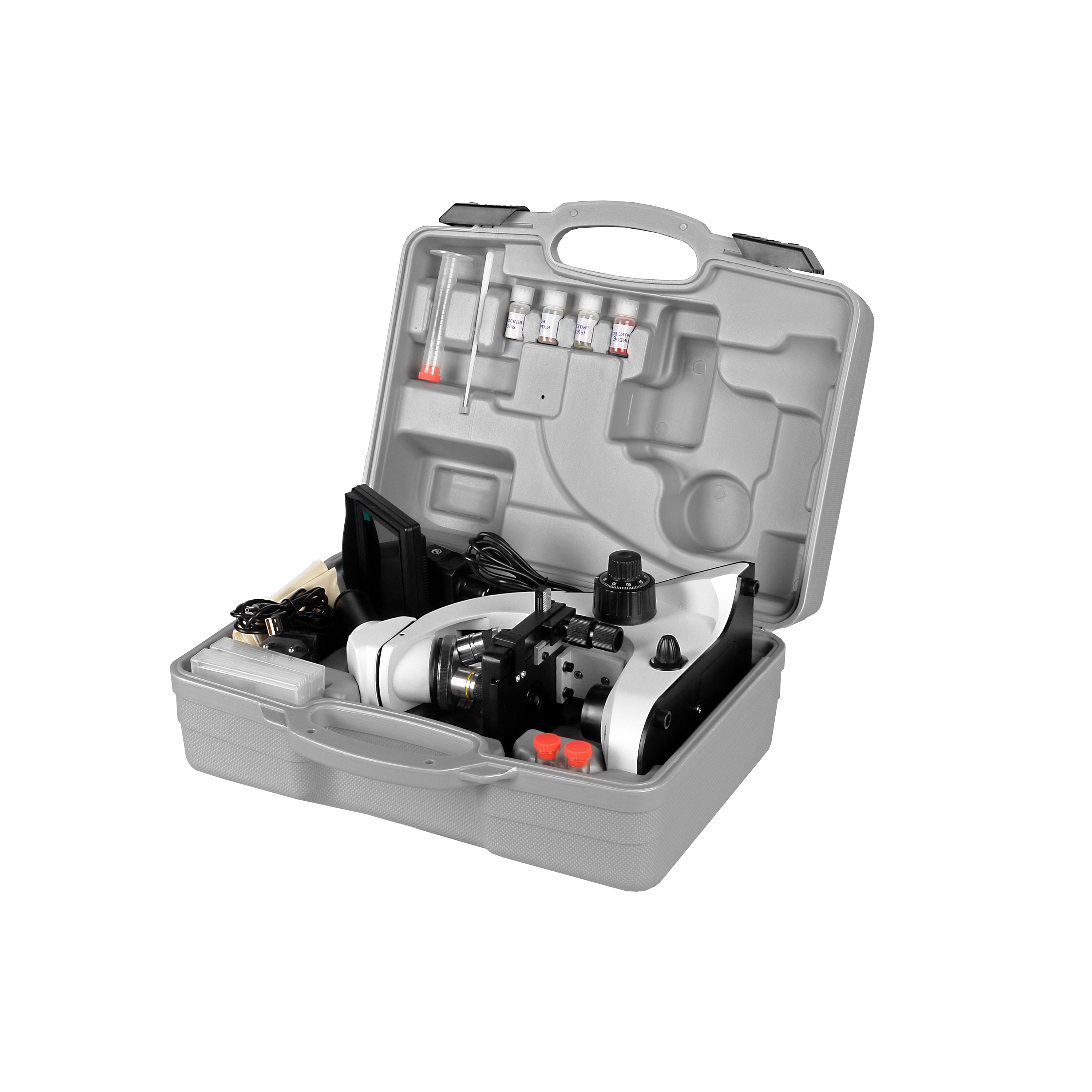 Монокулярный микроскоп с камерой и LCD монитором. Увеличение от 40х до 2000х, максимальное до 4000х. Наблюдения в проходящем и отраженном свете. Револьверное устройство на 4 объектива. Тонкая фокусировка со шкалой 1 мкм, механический двухкоординатный столик. Питание от сети и от батарей. В комплекте жесткий кейс и мини-лаборатория с препаратами и принадлежностями.