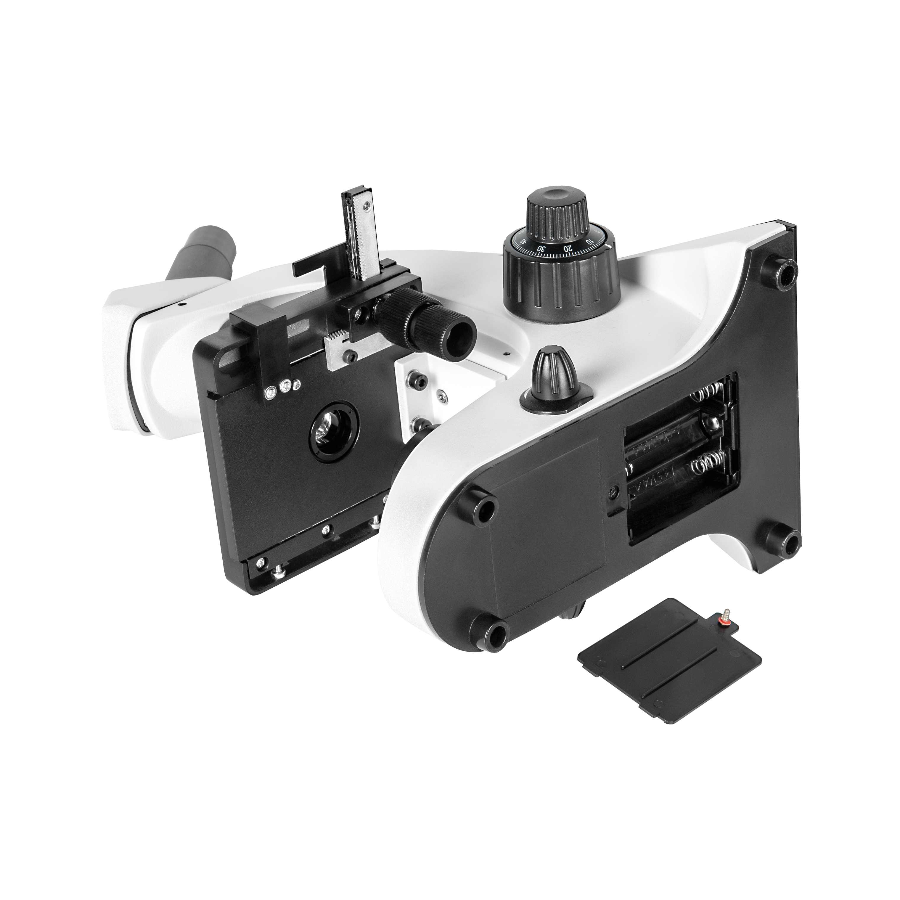 - Штатив со встроенным в основание LED осветителем проходящего света, LED осветителем отраженного света, револьверным устройством на 4 объектива и механизмом тонкой и грубой фокусировки
