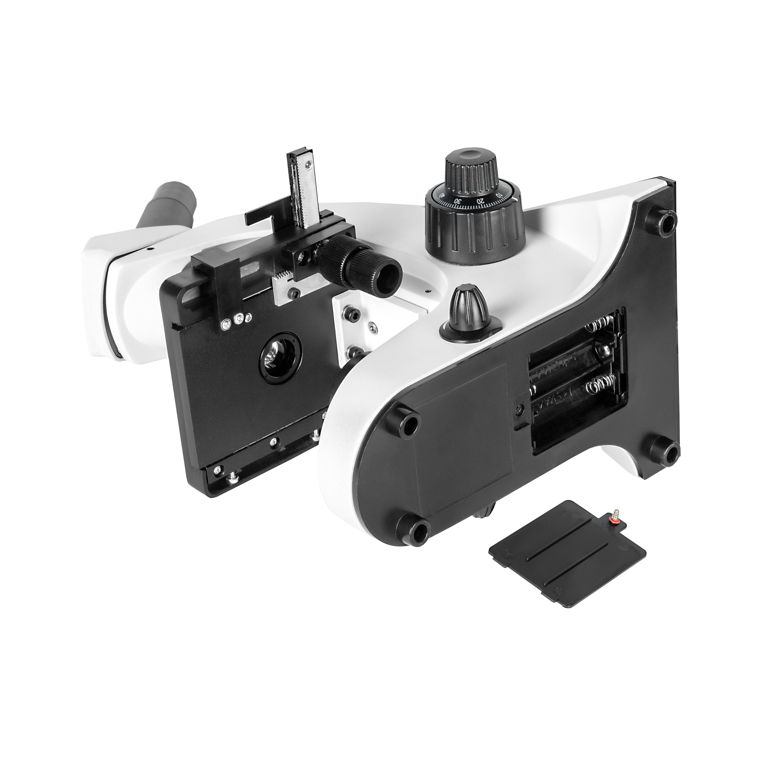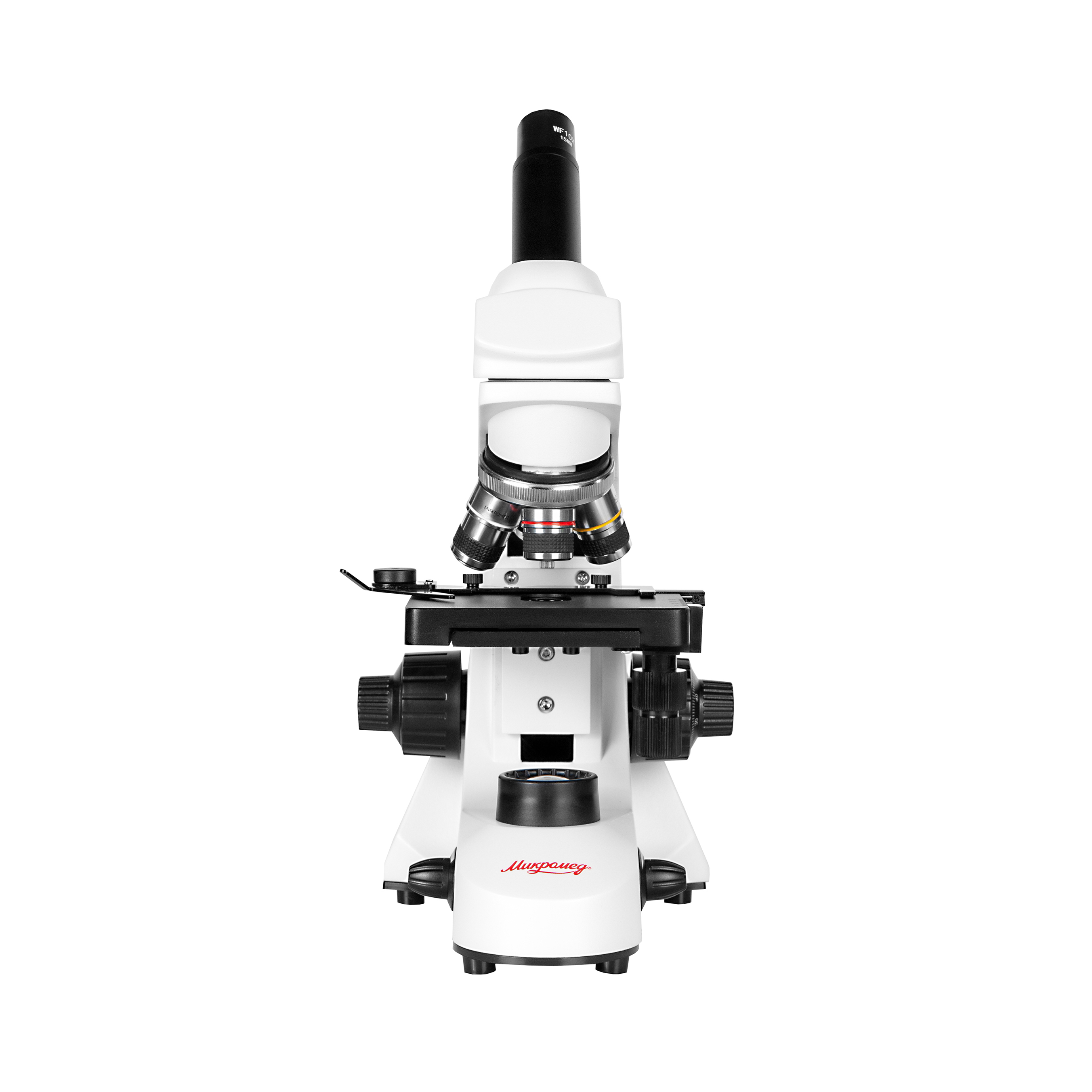 - Штатив со встроенным в основание LED осветителем проходящего света, LED осветителем отраженного света, револьверным устройством на 4 объектива и механизмом тонкой и грубой фокусировки