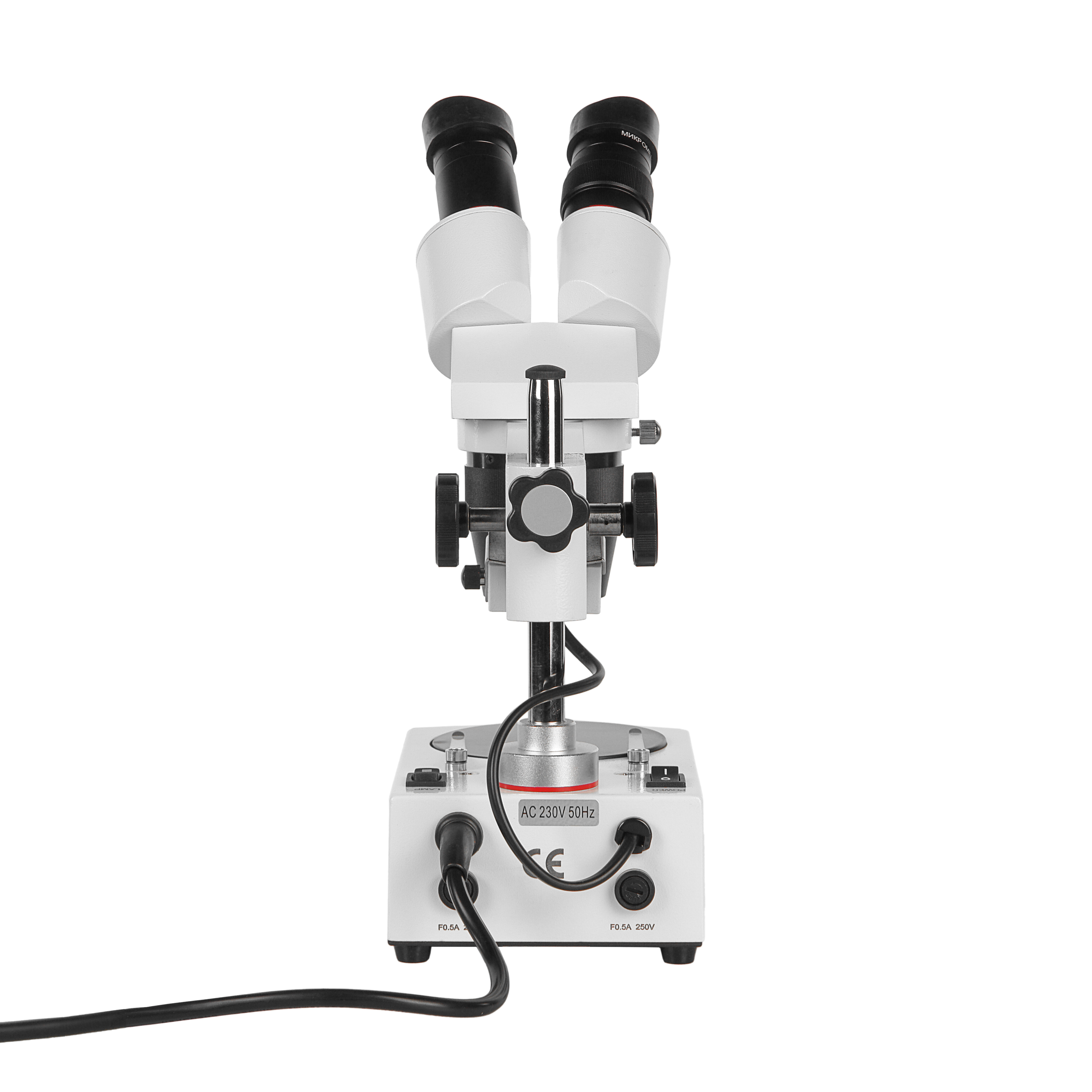 Стереомикроскоп предназначен для проведения исследований в отраженном и проходящем свете. Для подсветки предмета предназначены встроенные в его конструкцию осветители с низковольтными галогенными лампами. Осветитель отраженного света встроен в штатив и имеет линзовый коллектор в оправе, что позволяет получать яркой равномерное пятно в плоскости предмета. Осветитель проходящего света для обеспечения равномерности освещения снабжен матовым рассеивателем и встроен в основание. Блок питания осветителей расположен в основании микроскопа. При необходимости использовать дополнительный осветитель отраженного света, его можно выбрать из ассортимента дополнительных принадлежностей.