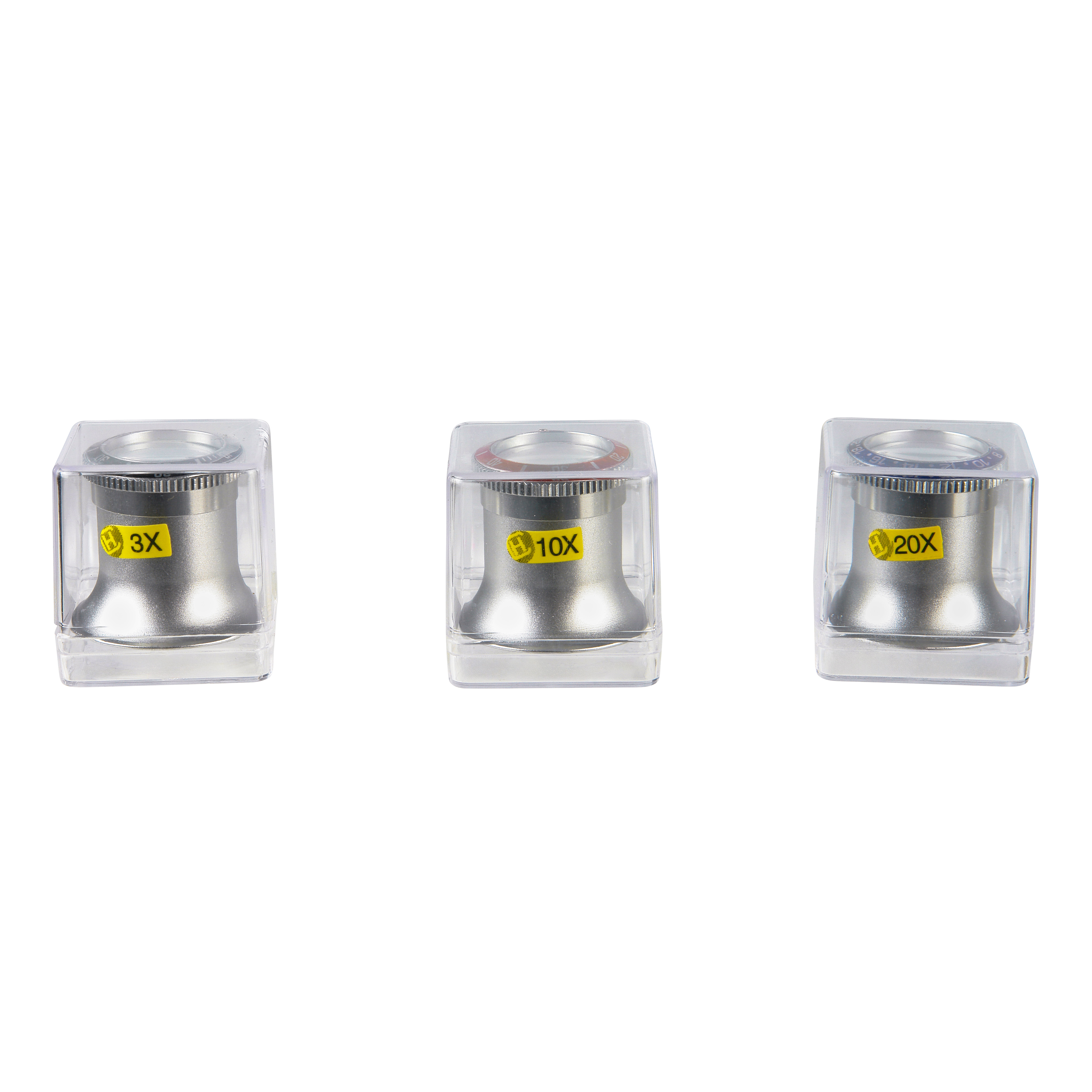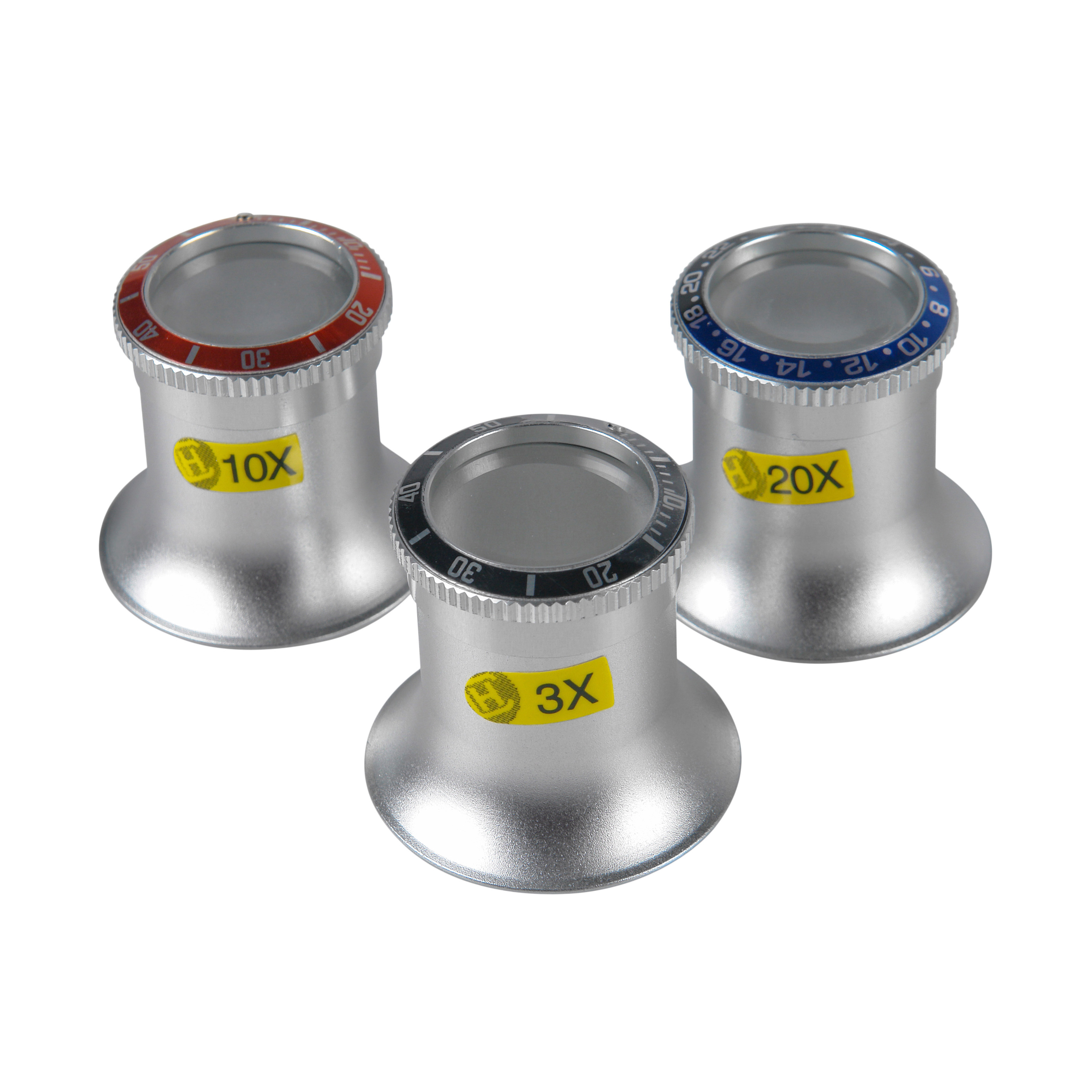 Комплект луп с увеличением 3х, 10х, 20х, диаметр линзы 22 мм, материал: оптический поликарбонат, алюминий.Набор луп часовых Veber MG15-3 с увеличением 3х, 10х и 20х подходит для работы с часовыми механизмами, электроникой, ювелирными изделиями, книгами и картами.